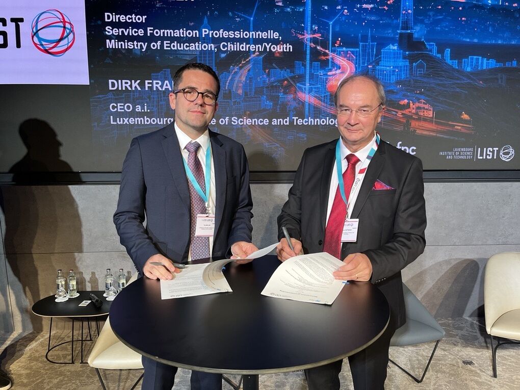 Alongside this event, LIST and the National Centre for Continuing Vocational Training (CNFPC) signed a partnership to enhance their collaboration. This agreement aims to explore opportunities for organizing and delivering training programs in fields such as sustainable construction, water management, remote sensing, biodiversity, climate change, energy, and decarbonization. This collaboration seeks to strengthen ties between LIST and CNFPC, create long-term collaborations, and provide specialized training and conferences for public servants in Luxembourg, supporting current and future projects with LIST's expertise.